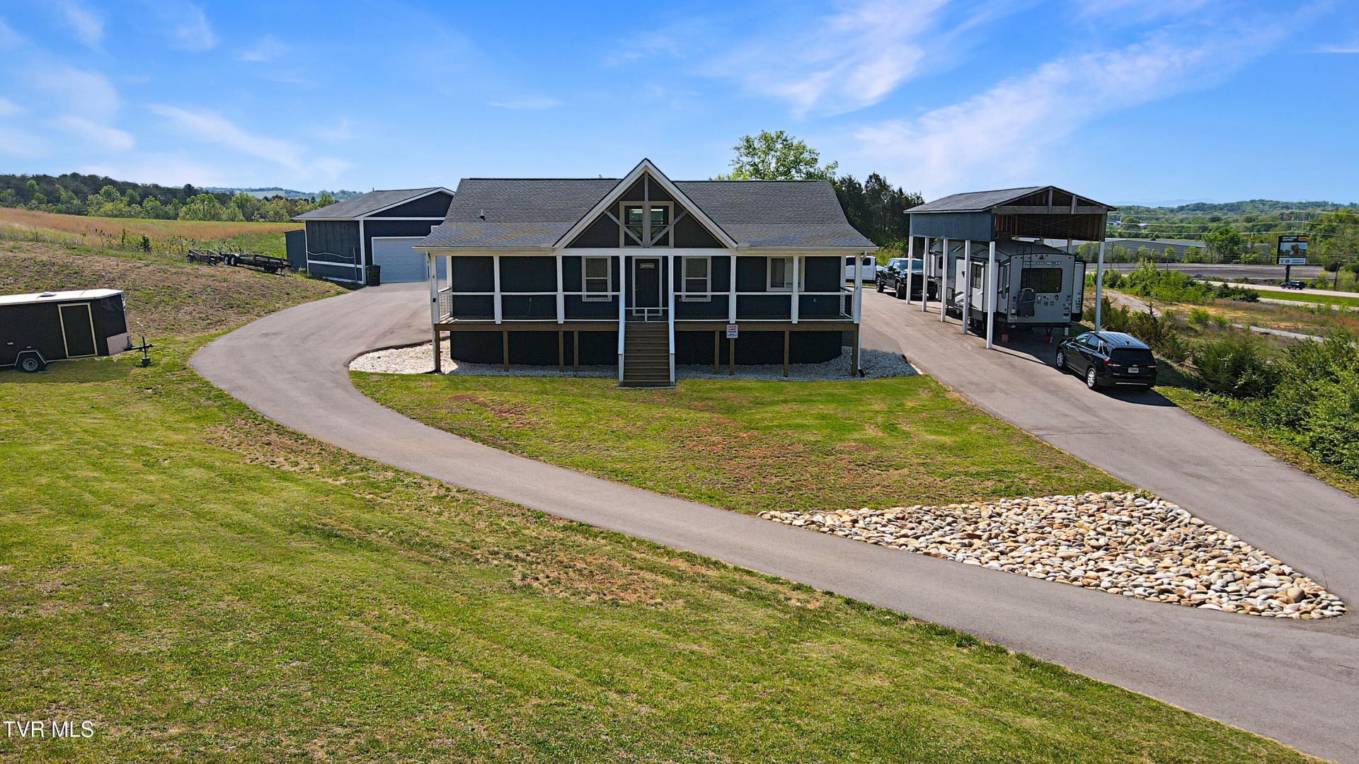 Welcome to this beautifully crafted modern farmhouse, originally built as new construction and thoughtfully maintained, now offered to the market for the first time since its completion. Set in a peaceful, elevated setting with expansive views, this property offers a rare combination of quality construction, functional upgrades, and modern design.A fully paved circular driveway leads you to the home, enhancing both convenience and curb appeal. The striking navy exterior, crisp white trim, and warm wood accents create a welcoming first impression. The home features both front and rear covered porches, providing multiple outdoor living spaces to relax, entertain, and take in the surrounding landscape.Inside, the open-concept layout is highlighted by vaulted ceilings and a stunning wood inlay ceiling that anchors the main living space. The living room flows seamlessly into a well-appointed kitchen featuring white cabinetry, stainless steel appliances, a large center island, and ample storage--ideal for both everyday living and entertaining.The spacious primary suite offers a true retreat, complete with a spa-like bathroom featuring a walk-in tile shower, freestanding soaking tub, and dual vanity. Additional bedrooms and flexible living areas provide options for guests, a home office, or multi-purpose use.Since purchase, the sellers have made extensive improvements that significantly enhance both functionality and value. These include a fully paved circular driveway, added cabinetry and a 16x10 upper deck to the garage, and multiple landscaping upgrades including yard leveling and rock mulching for low-maintenance appeal.The exterior improvements truly set this property apart. The detached garage/workshop features a 10' garage door and is positioned on a grade that can accommodate larger vehicles. A 50-amp RV hookup is already in place and can also be utilized for EV charging. The open-air RV storage structure measures approximately 14' x 40', providing excellent covered space for recreational or oversized equipment.In addition, three large storage buildings have been added, one of which includes a partially finished, air-conditioned office space--perfect for remote work, a business setup, or creative use. The home also includes dual floored attic spaces, offering valuable additional storage rarely found in comparable properties.Combining the benefits of newer construction with substantial post-build upgrades, this property offers a unique opportunity for buyers seeking space, versatility, and modern comfort in a private setting.Seller is a relative of the Listing Agent. Buyer/Buyers Agent to verify all information.